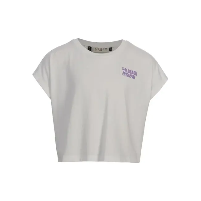 T-shirt Wit in een Katoen / Modal blend Coole loose fit die je styled door hem stoer te knopen aan de zijkant. Kleine Lila print op de borst. Loose fit / Normale fit / Normale lengte. Korte mouw / Mouwloos.