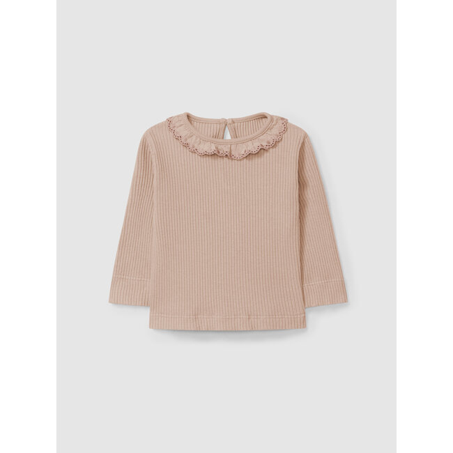 Longsleeve van geribbelde jersey van biologisch en gerecycled katoen met een geplooide, geborduurde kraag. Traanvormige opening aan de achterkant.