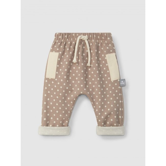 Bedrukte pull-upbroek van zacht geborsteld pluche met zeer vormbaar en warm biologisch katoen. Decoratief trekkoord in de taille. De boord kan zowel opgerold als omgeslagen worden gedragen voor extra duurzaamheid.