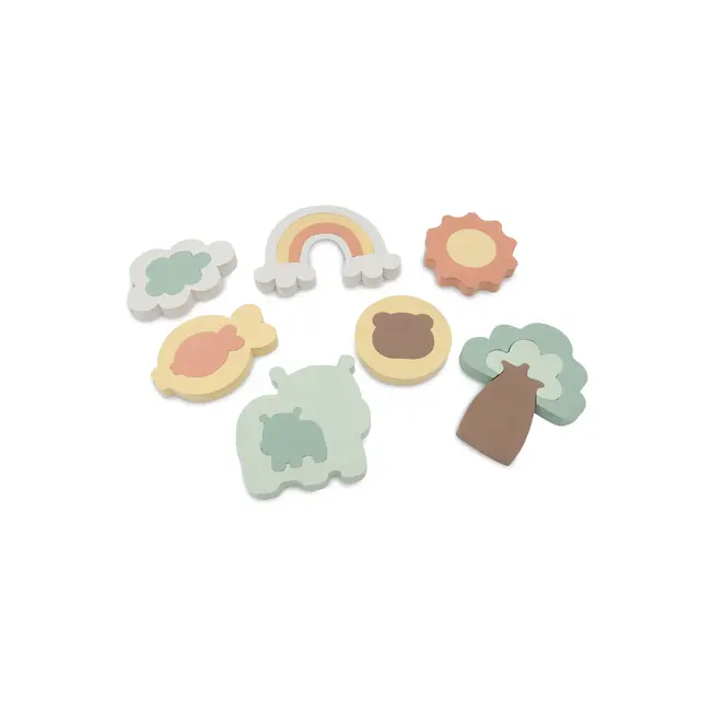 Badtijd! Deze puzzel maakt van badtijd speeltijd. De zachte foam stukken blijven drijven in het water en plakken tegen de natte wand van bad of douche. Zo kan je kindje de vormen keer op keer verschuiven en opnieuw puzzelen, de combinaties zijn eindeloos.