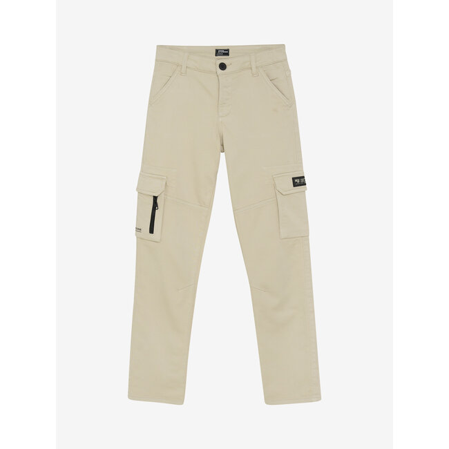 Trendy cargobroek van Indian Blue Jeans. De broek heeft twee zakken aan de zijkanten, wat zorgt voor een stoere look. De broek heeft een lichte, effen kleur met zwarte details op de zakken en bij de knoop in de taille.