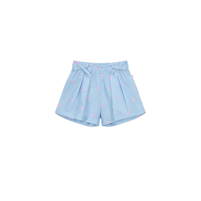 Deze lichtblauwe korte broeken hebben een frisse zomerse uitstraling met hun fijne strepen en kleine roze palmbomenmotief die de stof omgeven. De kleine strikjes aan de voorkant voegen een zoet, gepolijst detail toe. Een luchtige korte broek die ideaal is voor warme dagen en makkelijk te combineren is met veel outfits.