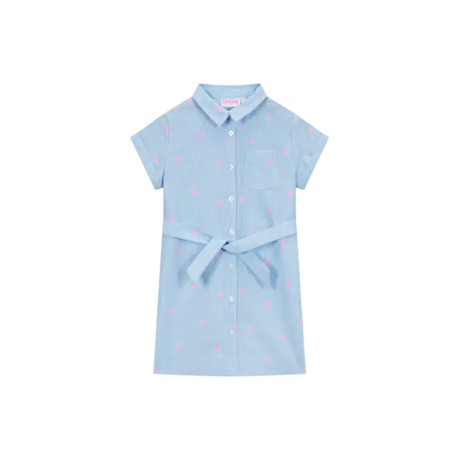 Deze luchtige jurk combineert fijne blauwe strepen met kleine roze palmbomen die direct een zomerse sfeer geven. De knopen aan de voorkant en de zachte kraag houden het speels terwijl het er toch netjes uitziet. De tailleband geeft vorm en geeft de jurk een charmant extra accent. Perfect voor warme dagen of wanneer je outfit wel wat vrolijke kleur kan gebruiken.