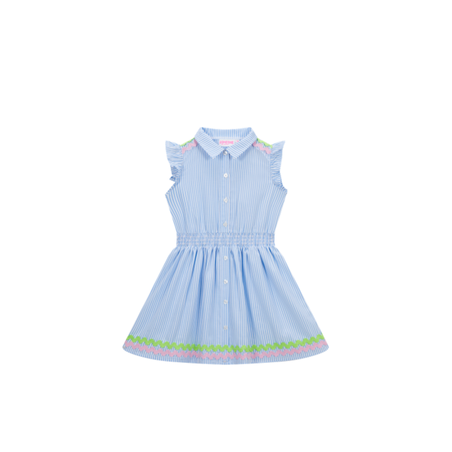 Deze jurk heeft een frisse blauw-witte streep die perfect aanvoelt voor de zomer. De gerimpelde schouders geven een speelse touch, en de gekleurde afwerking langs de zoom geeft het een vrolijke afwerking. De gerimpelde taille laat de rok mooi uitwaaieren. Het is een mooie optie voor dagen waarop je iets lichts en verzorgds wilt.