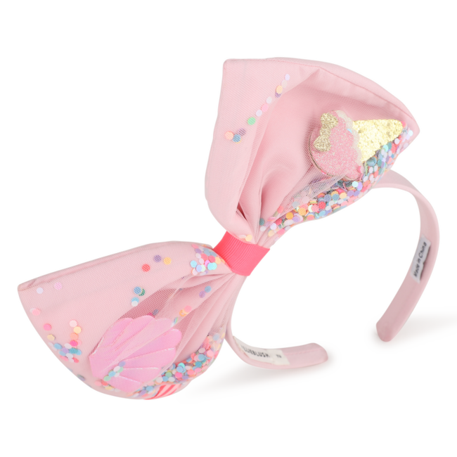 Een sprookje van tule voor kleine prinsesjes: XXL strik-haarband, confetti erin gevangen die bij elke beweging fonkelt, delicate reliëfelementen. Met stof omwikkelde structuur voor zacht comfort.