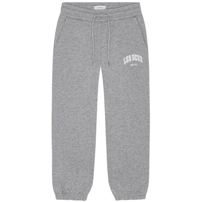 Stijlvolle Les Deux joggingbroek in gemêleerd grijs met witte logo-opdruk op de dij. De joggingbroek heeft een elastische tailleband met vetersluiting en elastische boorden aan de broekspijpen voor een optimale pasvorm. Praktische zijzakken bieden extra functionaliteit. De binnenkant van de joggingbroek is gemaakt van zacht, geborsteld katoen.