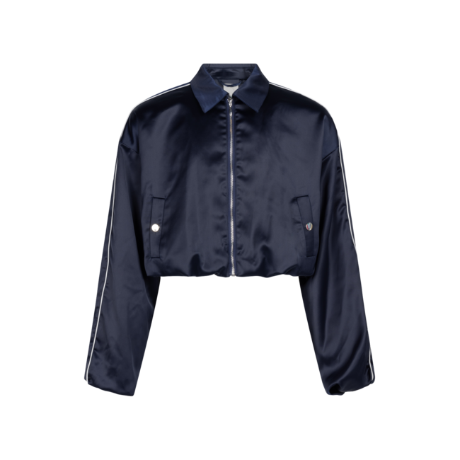 De Ilka-jas is een sportief ontwerp met een gladde, glanzende afwerking en een relaxte pasvorm. De witte biezen langs de mouwen en kraag geven een klassieke touch. Hij heeft een ritssluiting en drukknopzakken en is volledig gevoerd voor extra comfort. Combineer het met de Aurora-broek voor een opvallende coördinerende look.