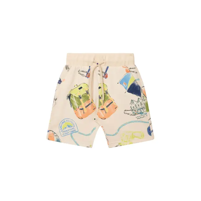 Deze shorts hebben een vrolijke outdoorprint met rugzakken, tenten en kleine reisdetails die direct een gevoel van avontuur oproepen. De zachte stof en comfortabele tailleband met trekkoord maken ze gemakkelijk te dragen, zelfs tijdens lange dagen buitenspelen. Dankzij de lichte basiskleur passen ze goed bij allerlei zomerse T-shirts en truien. Een perfecte keuze voor kinderen die graag op ontdekkingstocht gaan, rondrennen en nieuwe plekken ontdekken.