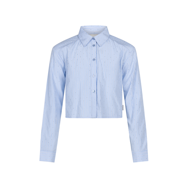 De Kenzi-blouse is een lichtgewicht ontwerp met een kraag en een knoop aan de voorkant. De stof heeft fijne lichtblauwe strepen met subtiele mini-stippen, wat zorgt voor een frisse en verzorgde uitstraling. De mouwen kunnen opgerold worden voor een meer ontspannen gevoel. Draag hem met de Merline shorts voor een moeiteloos, gecoördineerde outfit.