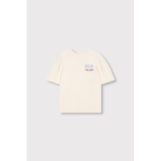 Met een kleine, kleurrijke 'ALIX CLUB'-afbeelding op de borst en een grote op de rug.
