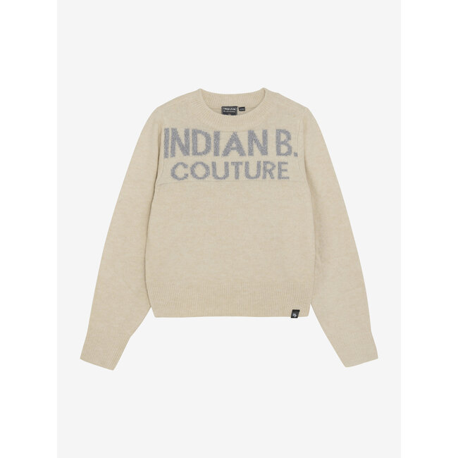 Eenvoudige gebreide trui van Indian Blue Jeans, met glittertekst op de voorkant, wat hem een moderne en opvallende touch geeft. Het effen ontwerp, gecombineerd met de zachte pasvorm, maakt hem zowel comfortabel als stijlvol.