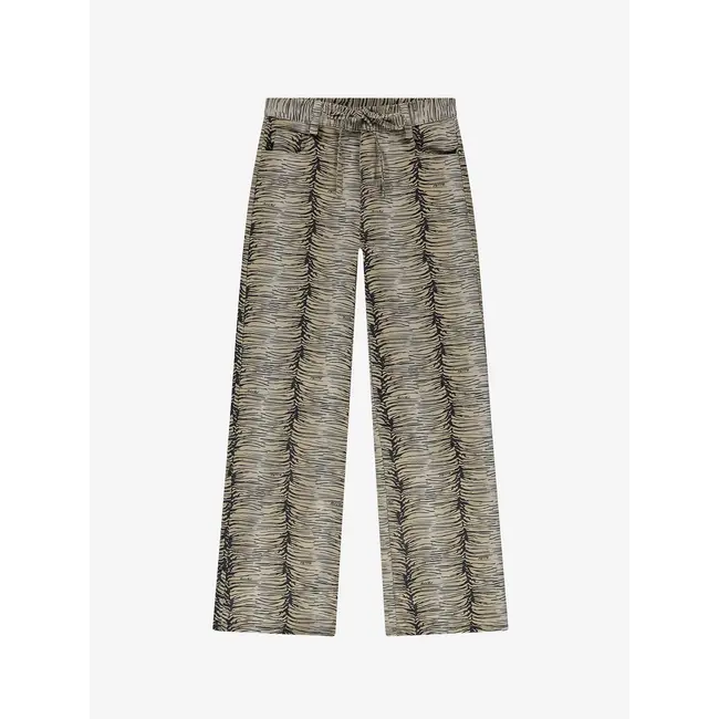 Broek met zebra print, subtiele logo's en een trekkoordjes. De broek is voorzien van zakken, een rits- en knoopsluiting en wijde pijpen.