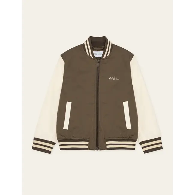 Een varsityjack voor kinderen, gemaakt van een zachte, licht glanzende keperstof met contrasterende mouwen en gestreepte ribboorden. Ontworpen met een strakke ritssluiting aan de voorkant en subtiele merkdetails op de borst, geschikt voor dagelijks gebruik.