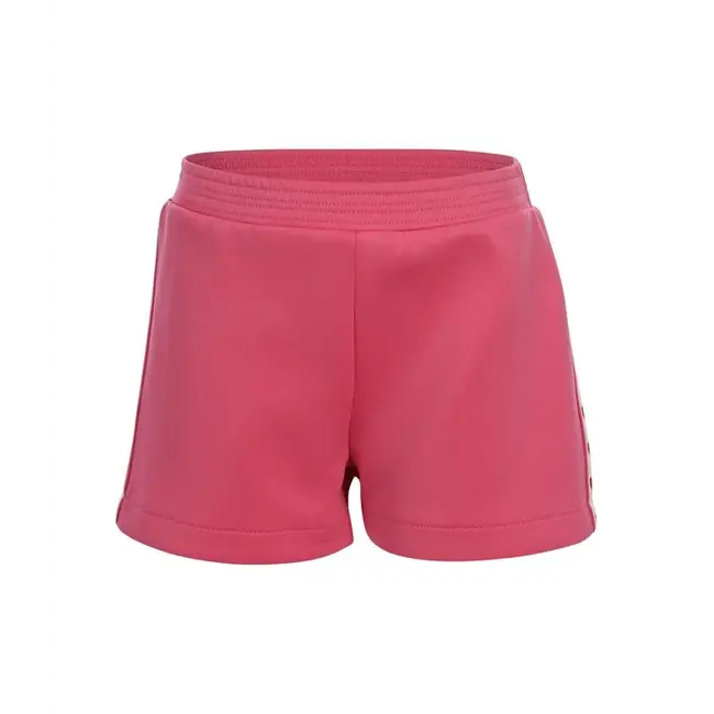 Shortje in een stoere trainingstof.Uni roze / pink jersey sweat kwaliteit.Stoere witte hartjes piping aan de zijkant.Elastische band.Korte lengte.