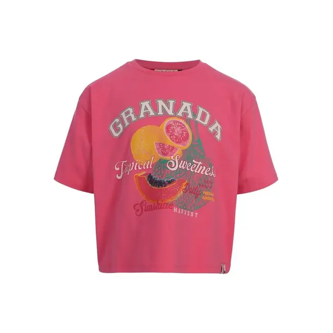 Cropped T-shirt Bubblegum T-shirt in a Happy Pink color! Twinning item met LXS dames t-shirt. Loose fit en Iets cropped fit. Zomers fruity artwork! Korte mouw.