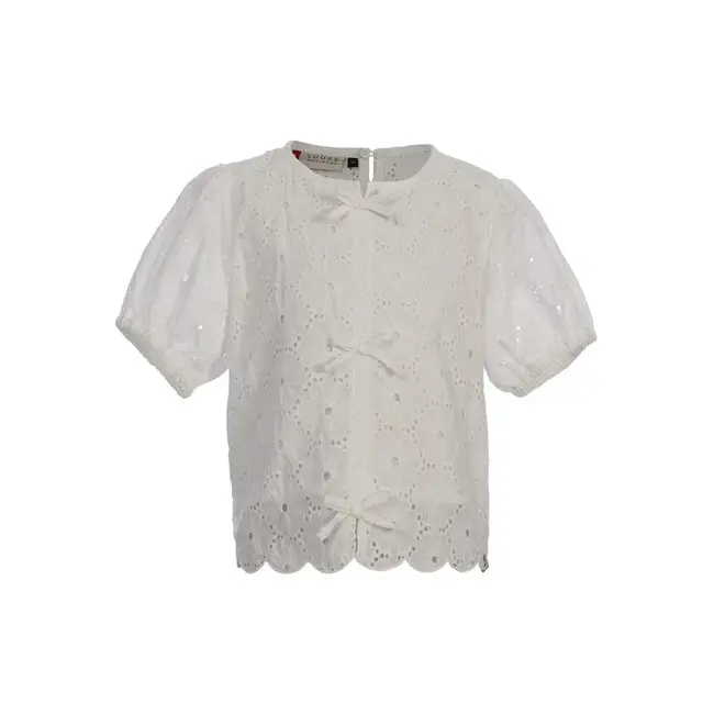 Wat een geweldig leuke TWINNING top voor Little. Katoenen broderie anglaise in zomers uni wit. Voorkant van de blouse is gevoerd met katoen. Leuke sier strikjes op de voorkant. Girly pofmouwtjes. Geschulpte afwerking.