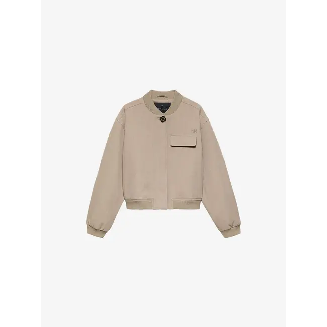 Jack met een dikke stof, een ronde hals, elastische tailleband en een drukknoopsluiting. Het jack is voorzien van geribde boorden en een knoopdetail.