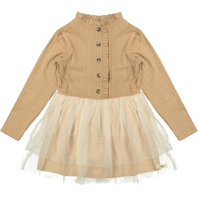 Meisjes jurk – Marly – peach – rib & tule – Baje Studio De Marly jurk van Baje Studio combineert comfort en elegantie op een unieke manier. Het bovenstuk is gemaakt van zachte ribstof die heerlijk draagt, terwijl de rok van luchtige tule een speelse en feestelijke uitstraling geeft. De knoopsluiting met ruffle detail aan de voorkant en de hoge halslijn maken dit jurkje extra stijlvol en bijzonder. Deze jurk is ideaal voor speciale gelegenheden, maar kan ook prima gedragen worden op school of een familiefeest. Verkrijgbaar in zowel grijs als peach, zodat je kunt kiezen tussen een ingetogen chique of een warme, romantische look. ✔ Comfortabele ribstof met stretch voor bewegingsvrijheid ✔ Tule rok voor een feestelijke uitstraling ✔ Ruffle details en knoopsluiting voor een verfijnde look ✔ Verkrijgbaar in twee kleuren: grijs en peach ✔ Perfecte meisjesjurk voor feestjes, verjaardagen of de feestdagen