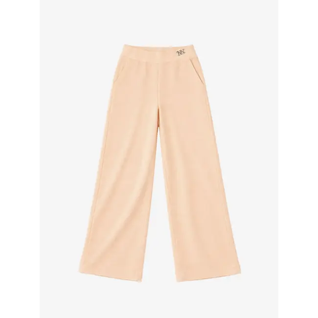 Zachte broek met een lichte structuur, een elastische tailleband en een subtiel logo. De broek is voorzien van zakken en wijde pijpen.
