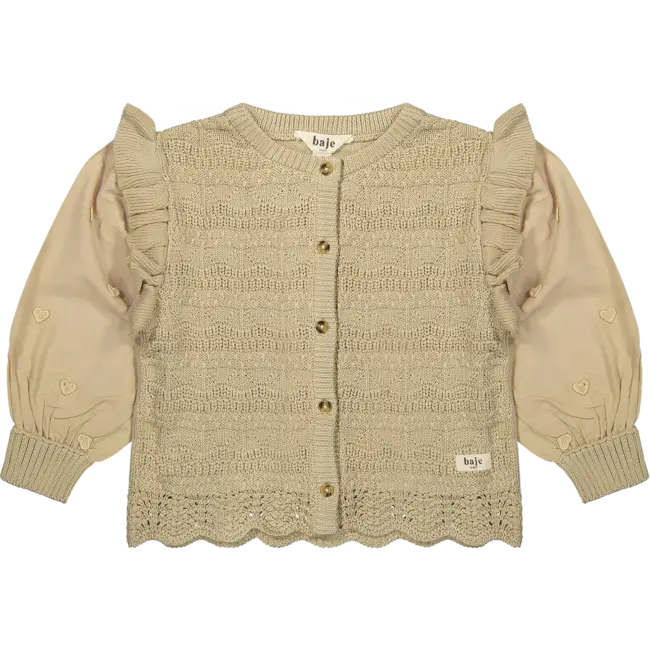 Baje meisjes vest – bruin gebreid vestje met hartjesmouwen Een echte blikvanger in de collectie: dit meisjes vestje van Baje combineert een fijn gebreide body met schattige mouwen vol hartjesdetails. De ruches langs de schouders en de mooie knoopsluiting maken dit vest extra bijzonder. Verkrijgbaar in bruin en zandkleur. ✔ Meisjes vest met hartjes op de mouwen ✔ Gebreide voorkant met speelse structuur ✔ Knoopsluiting en ruches voor een romantische look ✔ Verkrijgbaar in bruin en zandkleur ✔ Perfect om te combineren met jurkjes, rokjes of een jeans Dit Baje vestje met hartjesmouwen is ideaal voor zowel dagelijks gebruik als speciale gelegenheden. Een must-have item dat de outfit van elk meisje compleet maakt.