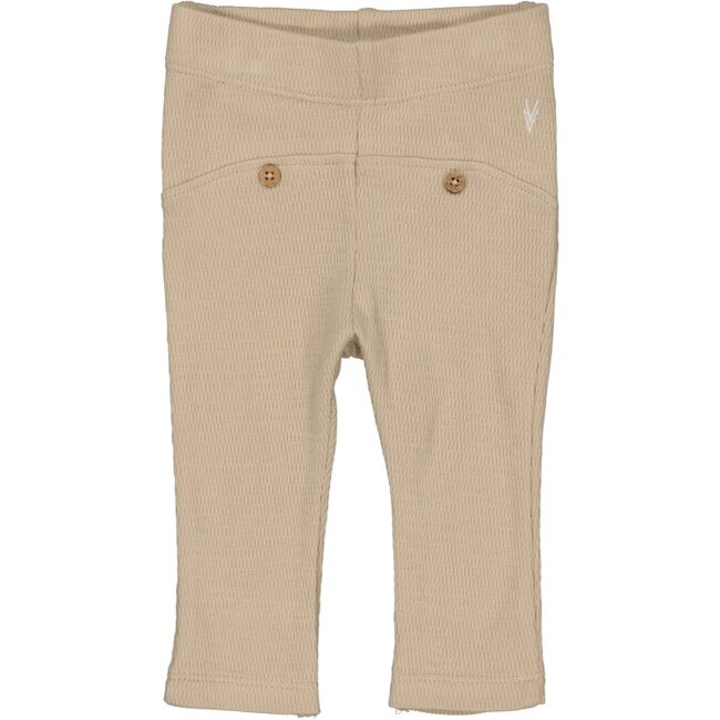 Een beige broek met knoopdetail aan de voorkant. Elastische band.