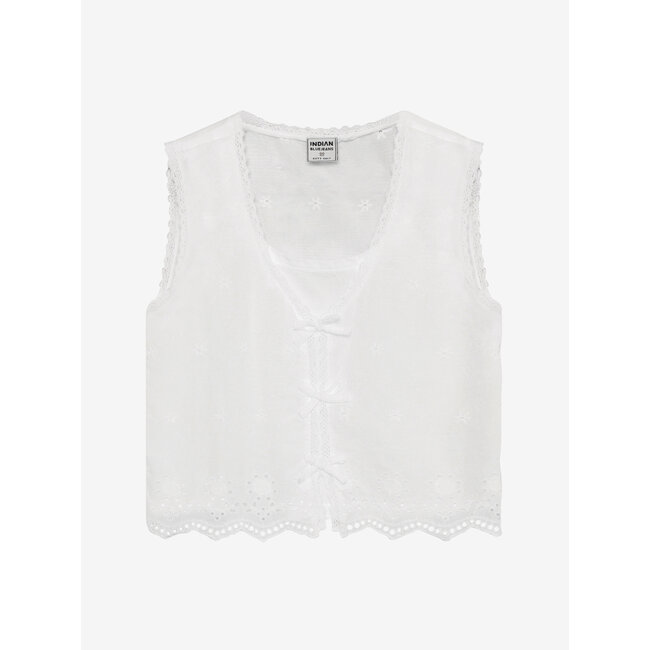 Mouwloze blouse van Indian Blue Jeans. De blouse heeft een geborduurd patroon over de hele stof en sluit met strikjes aan de voorkant.