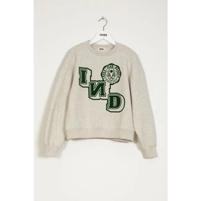 Het heeft een opvallend, groen IND-logo in collegestijl op de borst voor een sportieve, vintage-geïnspireerde look.