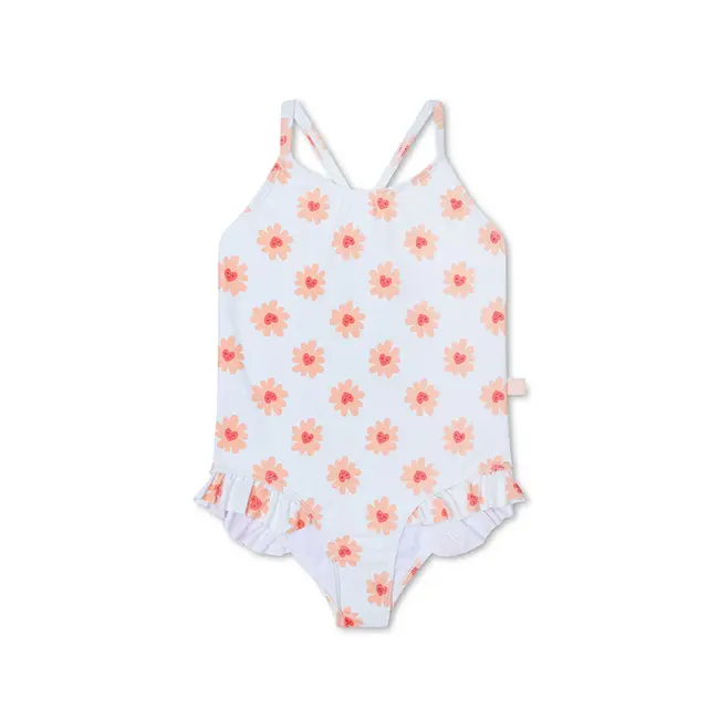 Schattig en beschermend meisjesbadpak met een vrolijke Floral Love-print, gemaakt van rekbare stof met UPF50+ bescherming voor een stijlvolle, zorgeloze zomer.