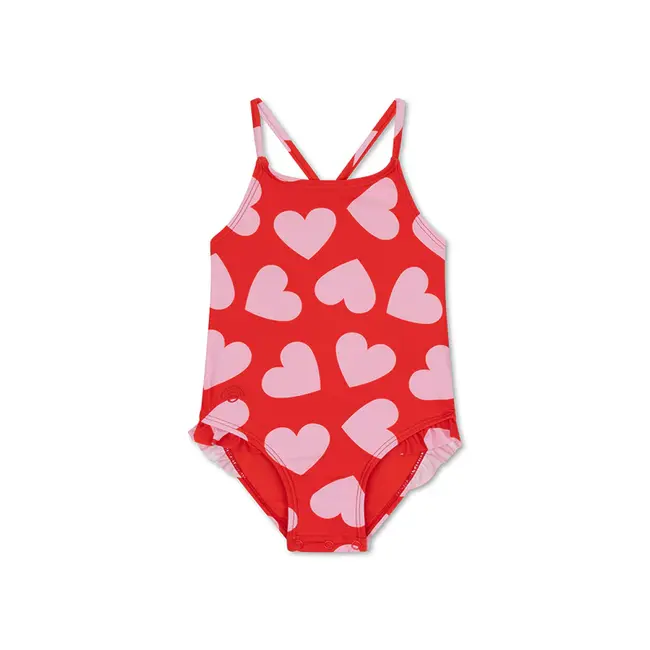 Schattig en beschermend meisjesbadpak met een speels hartjesprint, gemaakt van gerecyclede materialen voor zonnig, zorgeloos waterplezier. - Drukknoopjes tot en met maat 86/92; geen ruffles vanaf maat 122/128.