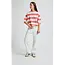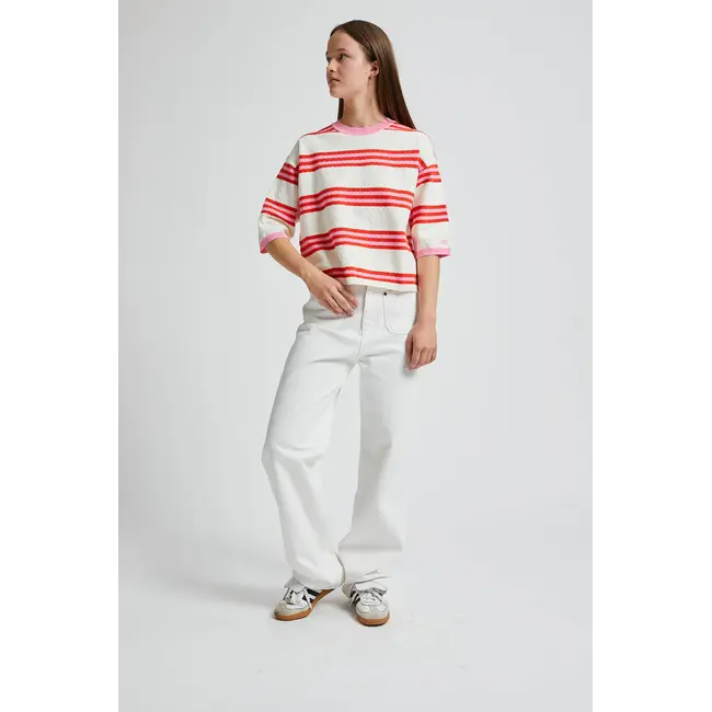 De VELVET trui in gebroken wit is een gestreepte trui. De hals is rond, de mouwen reiken tot de elleboog en de kraag, manchetten en zoom zijn geribbeld. Het breisel heeft een ruitpatroon en de horizontale strepen zijn wit, roze en rood. Het IND-logo is in roze geborduurd op de linkermouw en de manchetten en kraag zijn roze.