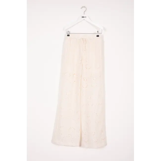 De VOSGES broek in gebroken wit is een wijde broek met geborduurde, uitgesneden bloemenmotieven. De tailleband is elastisch en heeft een striksluiting.